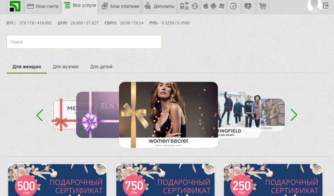 В «Приват24» магазин Gift Card находится в разделе «Все услуги». Карты разделены на три категории: мужские, женские и детские.