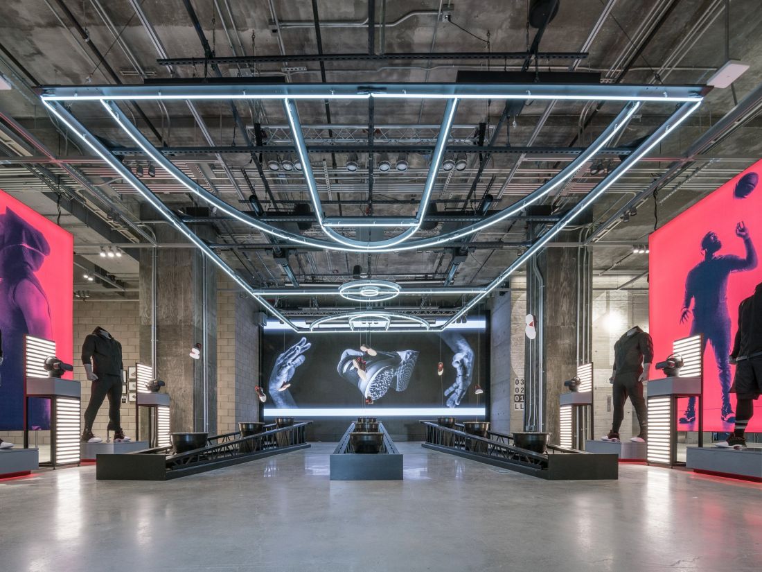 Новое пространство — пример той торговой «концепции стадиона» (метраж магазина почти такой, как футбольное поле), на которую команду бренда вдохновили спортивные стадионы средних школ. Магазин имеет вход через тоннель, стенды для просмотра игр в прямом эфире на больших экранах, стилизованные под школьные раздевалки примерочные и беговые дорожки, где клиенты могут опробовать кроссовки для бега.