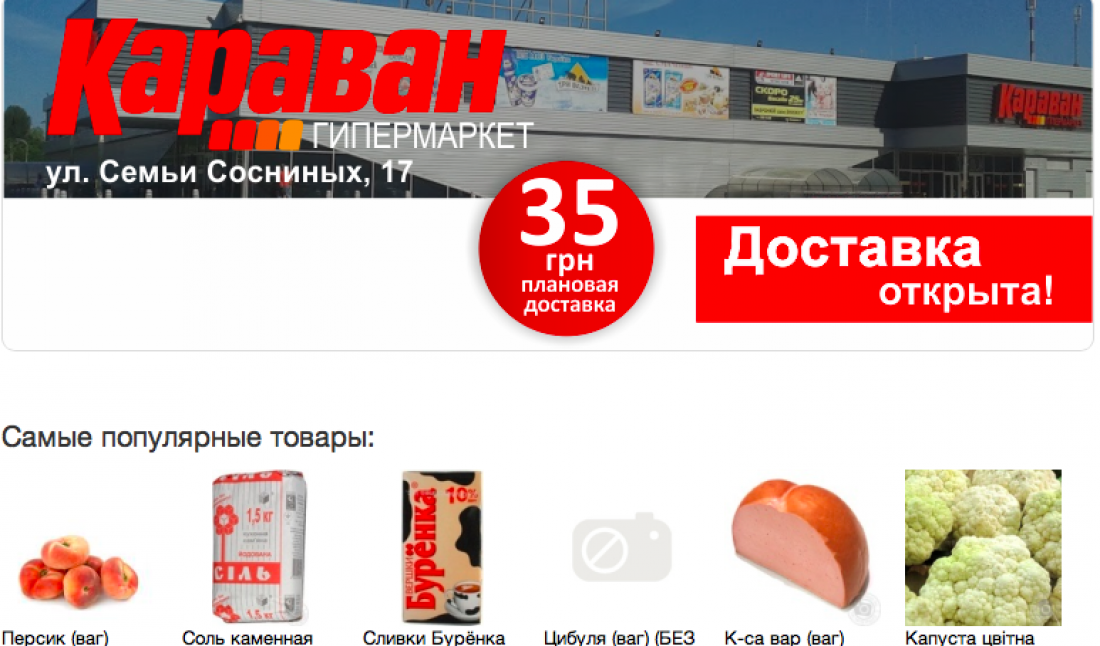 С 12 сентября Zakaz.ua осуществляет доставку товаров из гипермаркета «Караван», который расположен в Киеве на ул. Семьи Соснихиных, 17. Zakaz.ua - украинский сервис, осуществляющий доставку товаров из супермаркетов Novus, Metro, Фуршет и рынка Столичный. Цены на сайте такие же, как и на полках магазинов. Потребители оплачивают только доставку, стоимость которой варьируется от 35 до 69 грн.