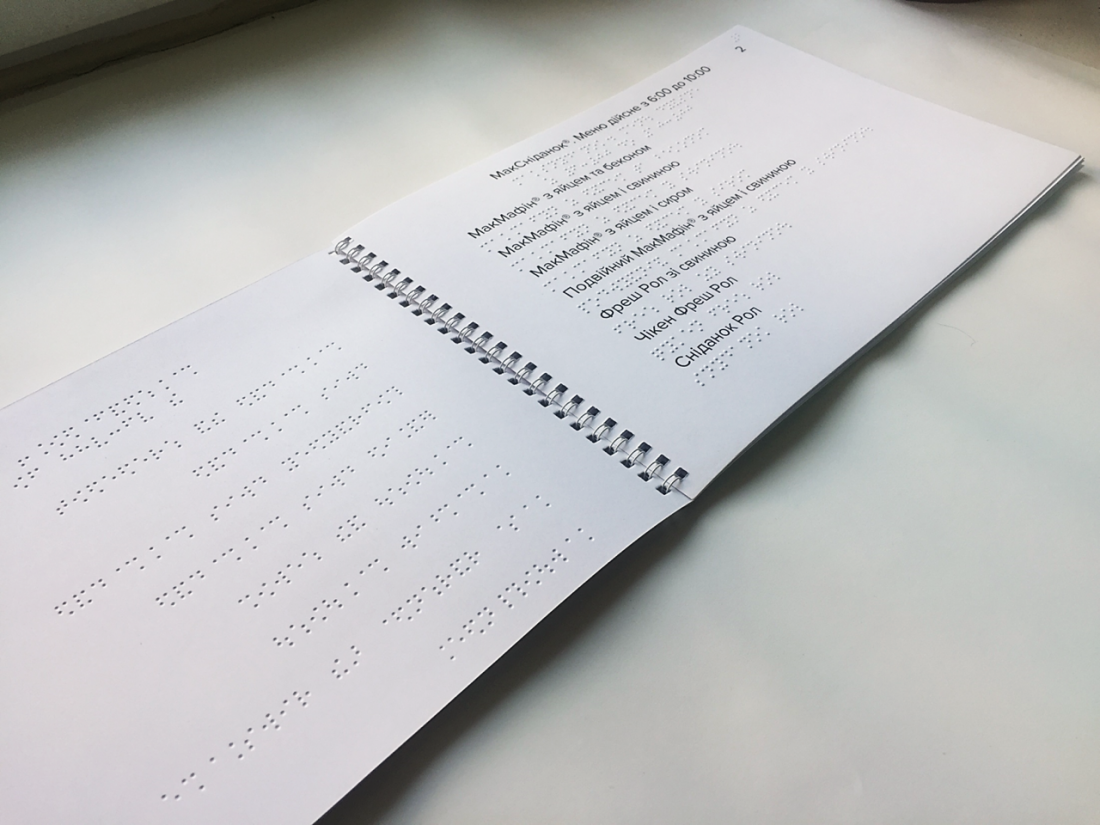 Инициативу по введению меню для незрячих людей компания «МакДональдз®» реализовала в сотрудничестве с Украинским обществом слепых (УТОС), которое помогло полностью адаптировать и изготовить основное меню заведений шрифтом Брайля.