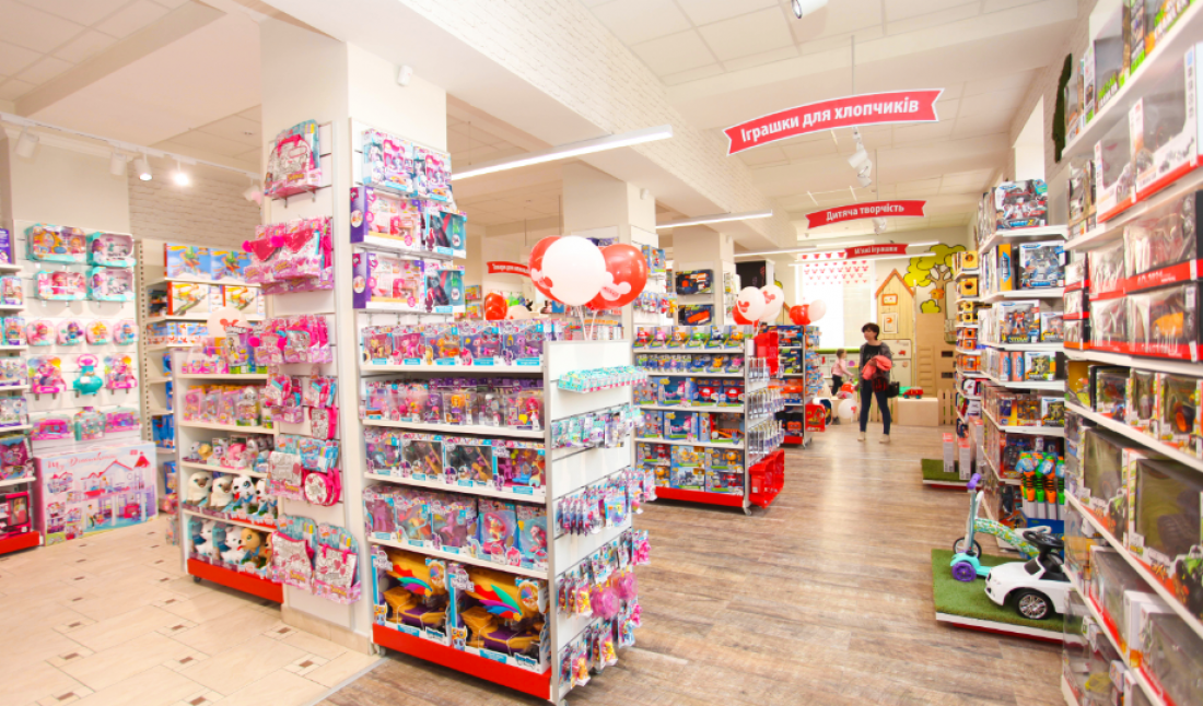 Площадь торговой точки — 300 кв. м. В ассортименте топовые игрушки, настольные игры, скейтборды и велосипеды, аксессуары, одежда и обувь для детей.