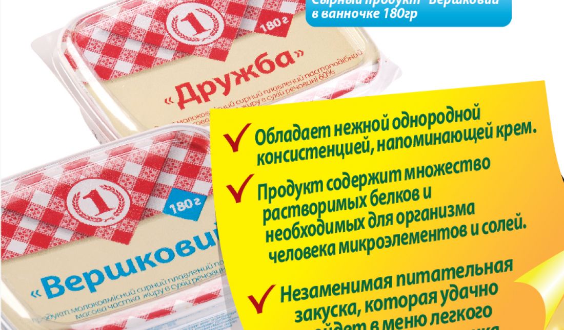 Сырный молокосодержащий продукт пастообразный представлен двумя видами: «Дружба» и «Сливочный», вес 180 гр. Обладает нежной однородной консистенцией, напоминающей крем. Продукт содержит множество растворимых белков и необходимых для организма человека микроэлементов и солей. Незаменимая питательная закуска, которая удачно войдет в меню легкого завтрака или пикника.