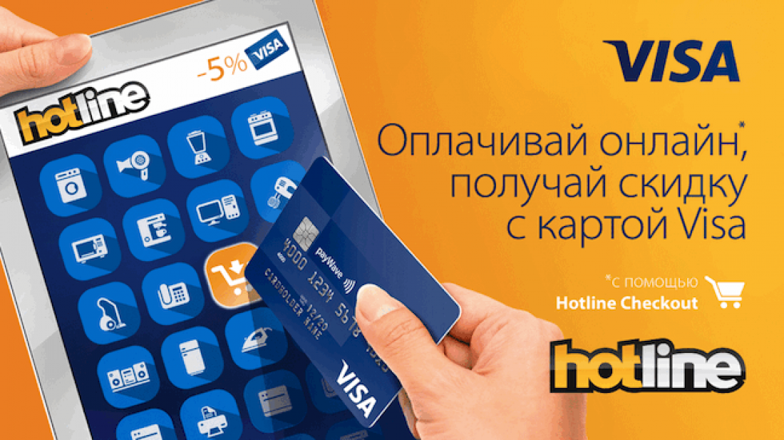 Visa и Hotline предлагают владельцам карт Visa воспользоваться 5%-й скидкой на товары при оплате картой Visa на сайте Hotline с помощью сервиса Hotline Checkout.