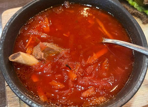 На смак – неймовірний борщ, з легкою кислинкою. Наваристий, насичений червоний колір і величезний шматок ребра (все ж, The Мʼясо). За канапку коментарі зайві – це класика. Однозначно вартує всіх витрачених грошей.