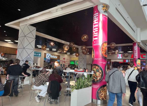 Фудкорт тут на третьому поверсі, і також загальний. Що цікаво, кілька закладів мають окремі приміщення, проте й столики ззовні – але вони все одно відокремлені від загального фудкорту.
