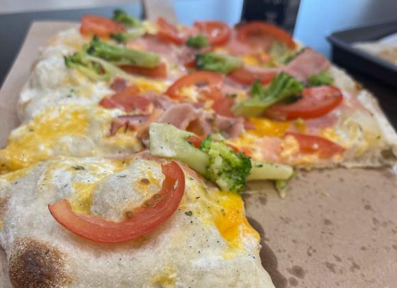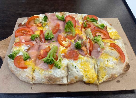 Знайшли столик швидко, хоча на фудкорті не було де яблуку впасти. На замовлення чекали до 10 хв. Одразу впало трохи в очі те, що пінса вживу відрізняється від пінси в меню – на картинці має більше бекону. І нам не дали із собою серветок.
