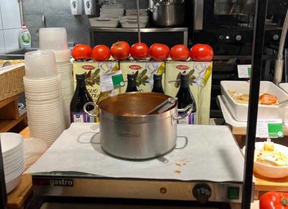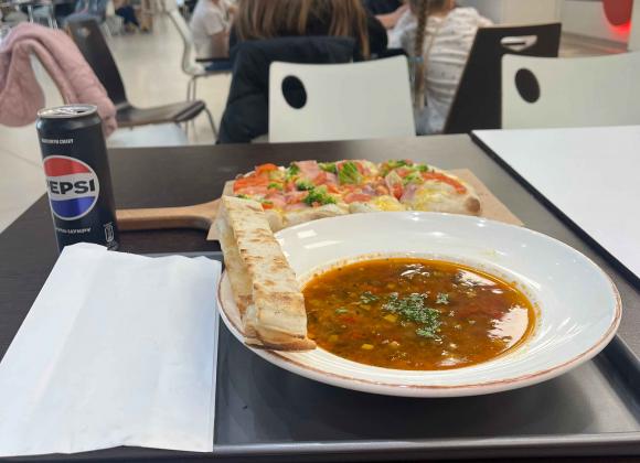 Але спершу спробували болоньєз. Суп насичений і густий, овочі мʼякі, майже розварені в пасту. Але трохи жирний – зверху є шар олії і лишається відповідний присмак. Проте як для першої страви – згодиться.