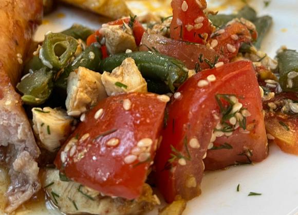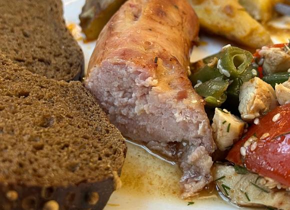Є салати, гарніри (запечена картопля, гречка), перші страви, мʼясо (сосиски, відбивні) та солодке (сирники, млинці, десерти).