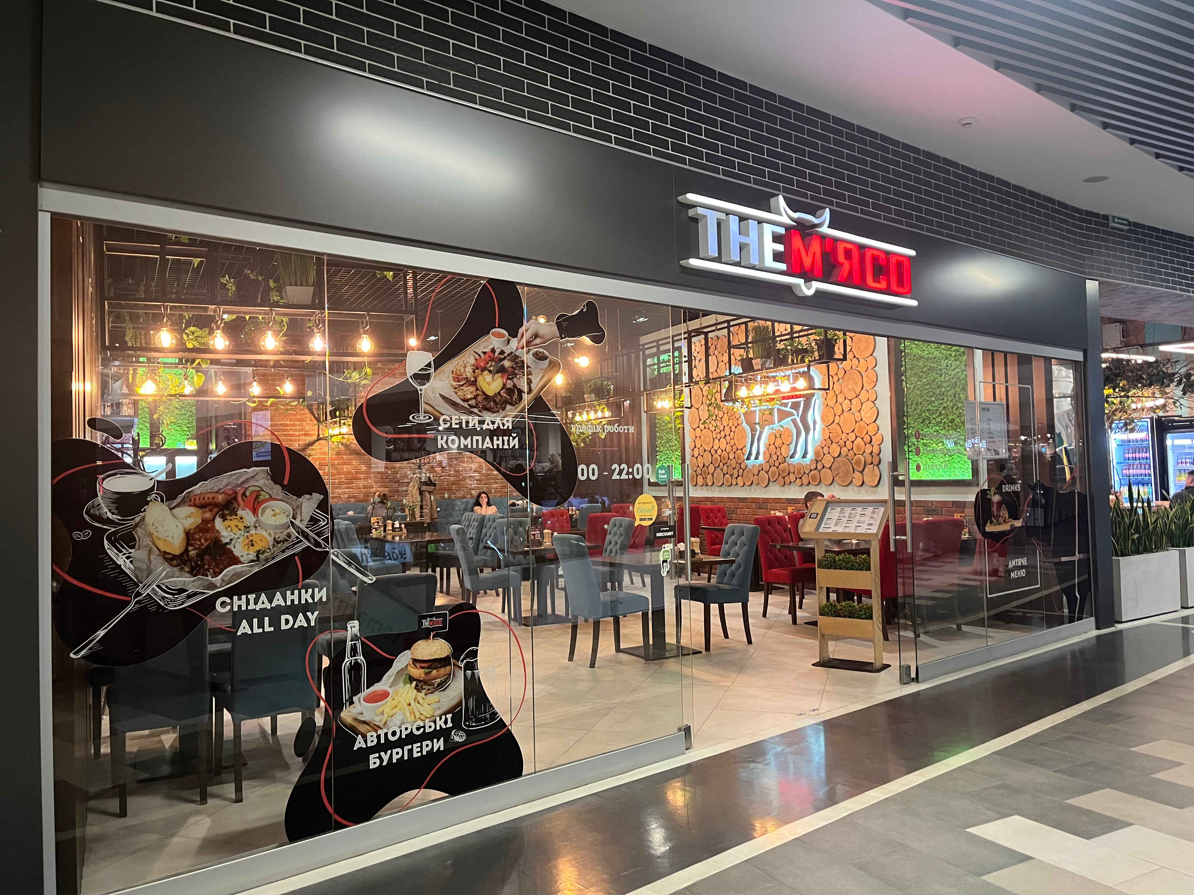 Найбільше виділився заклад The Мʼясо: великий простір, проте відкриті і скляні двері – відтак відкривається вид на весь ТРЦ. Назва говорить сама за себе: ресторан пропонує мʼясні страви. Це бургери, стейки, шашлики, котлети тощо. Звісно, від цього ціни вищі, ніж на загальному фудкорті. Проте якщо прийти у будні з 12:00 до 14:00, то заклад пропонує комплексні обіди лише за 260 грн.