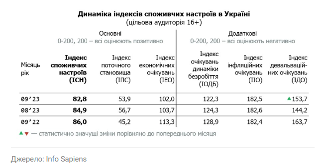 Індекс споживчих настроїв українців зменшився на 2,1 пункту і становив 82,8 за підсумками вересня. Про це пише ЛІГА.Бізнес з посиланням на дані щомісячного дослідження Info Sapiens