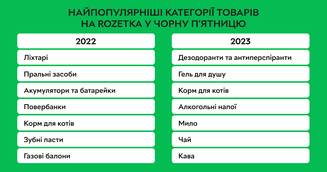 Серед усіх найпопулярніших категорій товарів на сайті онлайн-ритейлера у 2023 році — корм для котів, одяг та взуття, гель для душу та чай, тоді як минулого року найбільший попит мали ліхтарі, пральні засоби, акумулятори й батарейки та інші.