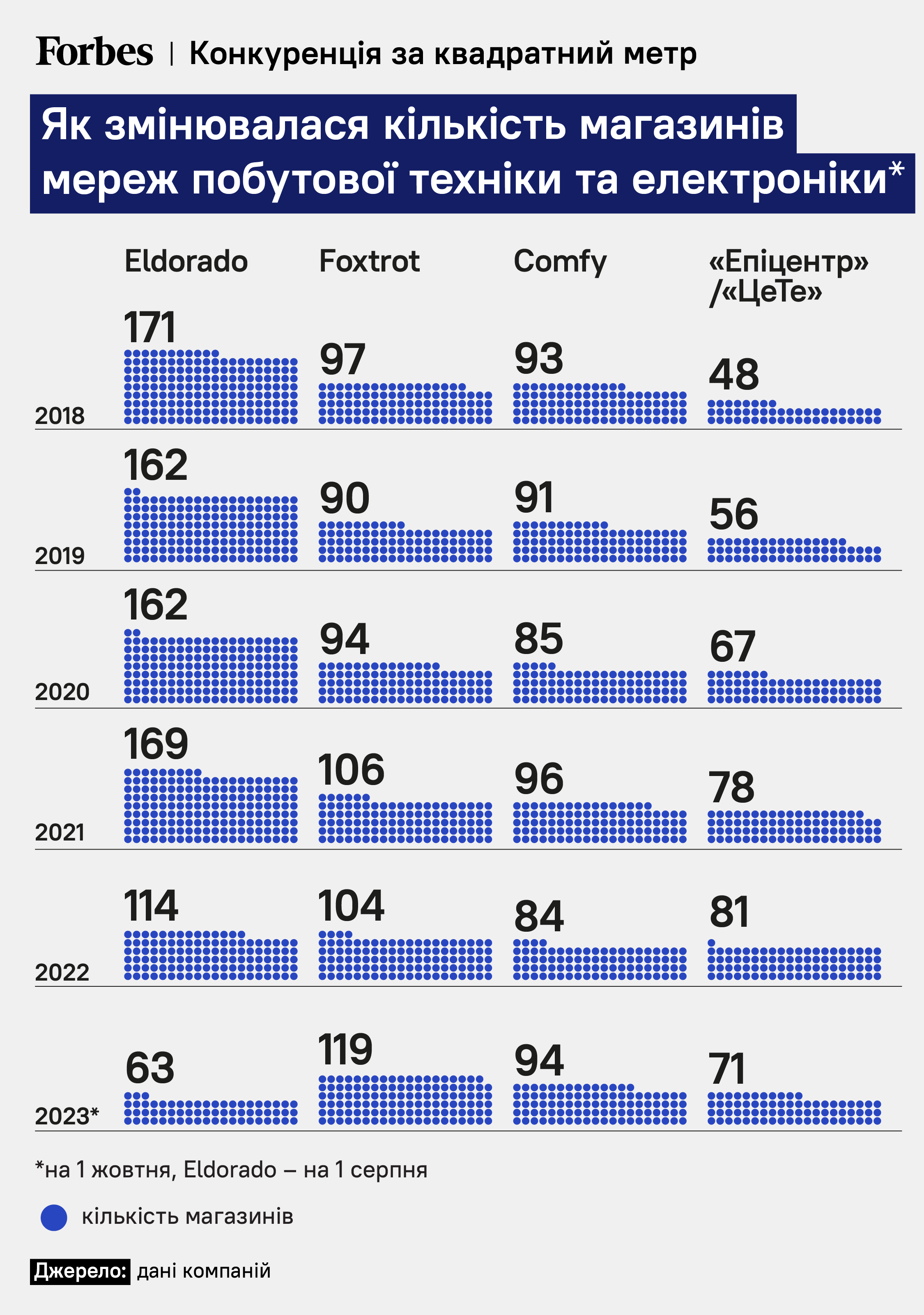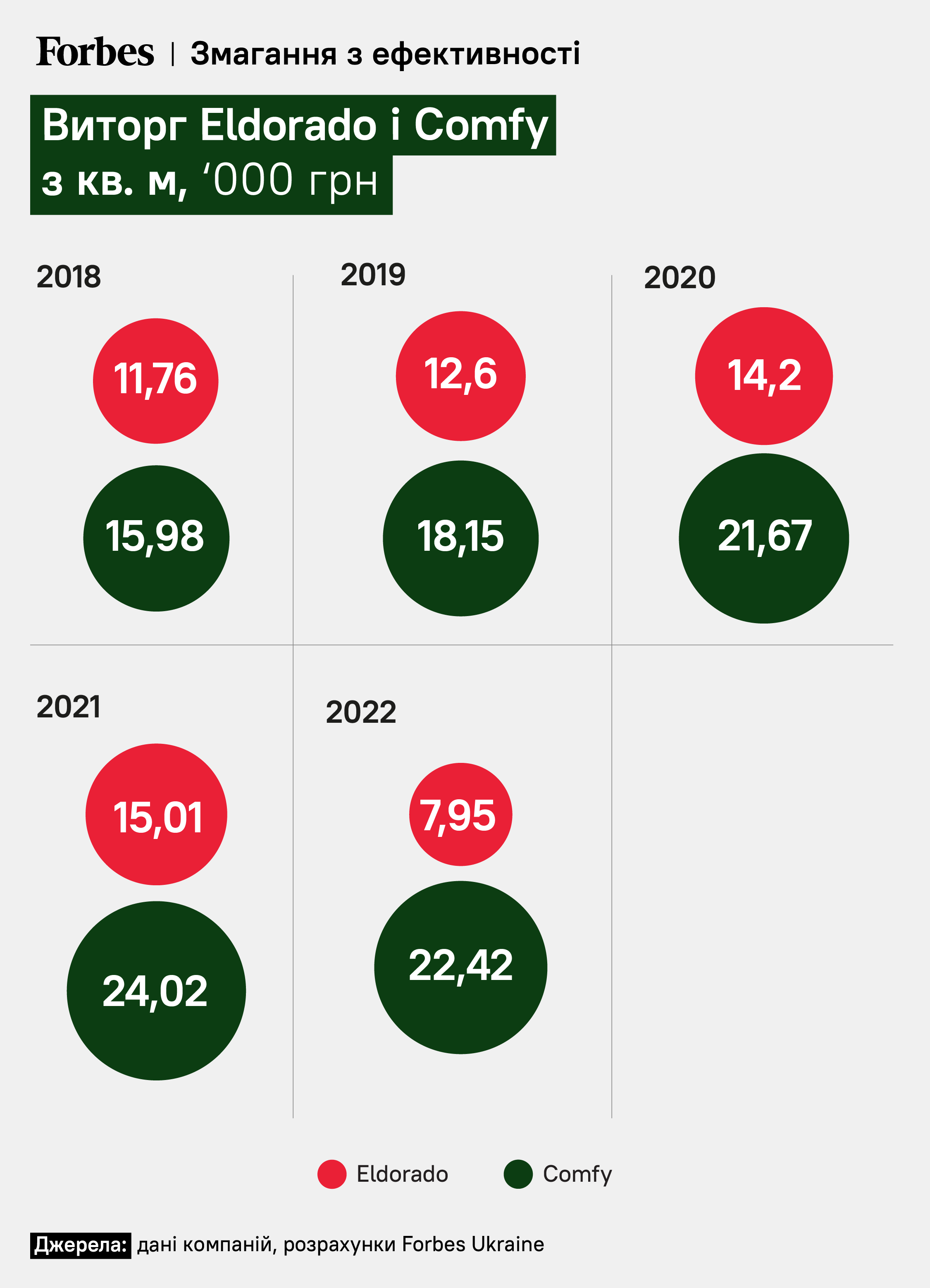 У ковідний 2020 рік Comfy заходив одноосібним лідером ринку. За майже однакової кількості магазинів і торгових площ у Comfy та Eldorado – 91 (62 500 кв. м) та 90 (63 800 кв. м) відповідно, але різниця у продажах становила більш як 30%, або 4 млрд грн.