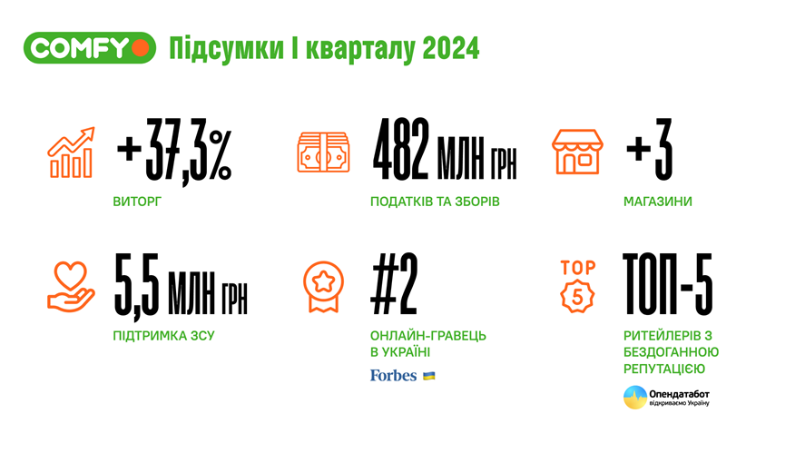 Підсумки роботи COMFY у І кварталі 2024 року: 482 млн грн податків та зборів сплачено до державного бюджету