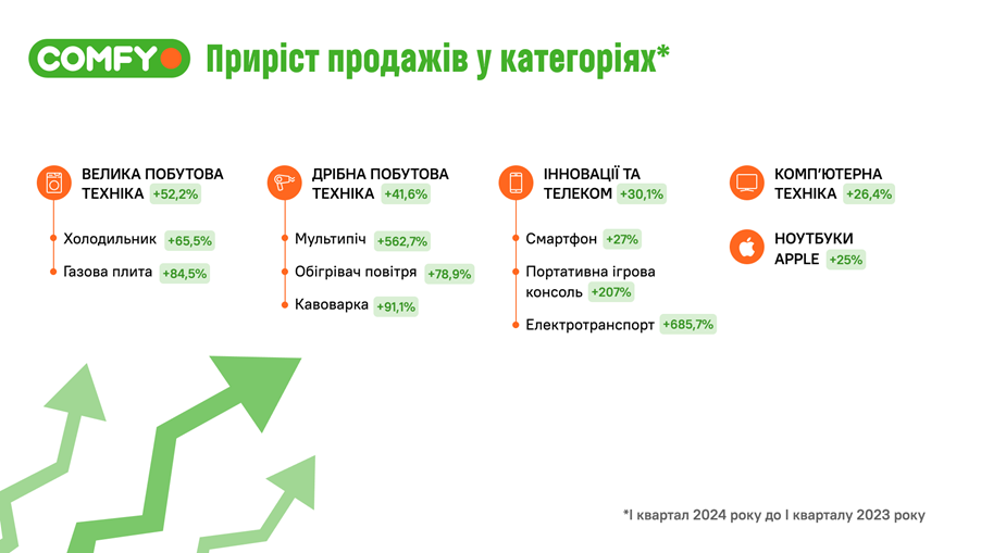 Крім того, COMFY стабільно нарощує продажі гаджетів. Так, бізнес-напрям “Інновації та телеком” зріс на понад 30%: смартфони +27%, ігрові консолі +207%, електротранспорт +685%.