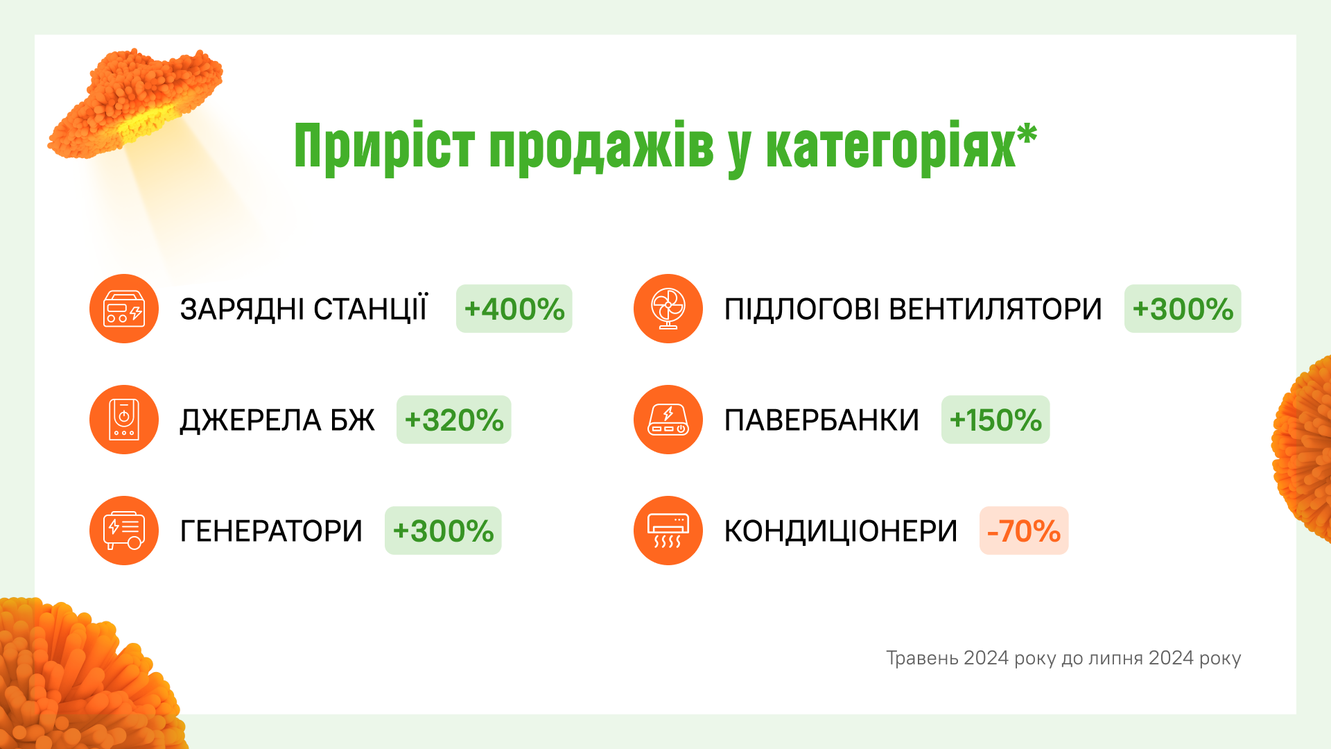 За підсумками двох місяців з початку тривалих відключень електрики українці почали активно скуповувати зарядні станції, генератори та павербанки. А стаціонарні кондиціонери поступились у продажах пересувним кондиціонерам та вентиляторам. За даними лідера ринку з продажів техніки та електроніки COMFY, в окремих категоріях попит зріс на 300-400% в порівнянні з березнем-квітнем 2024 року.