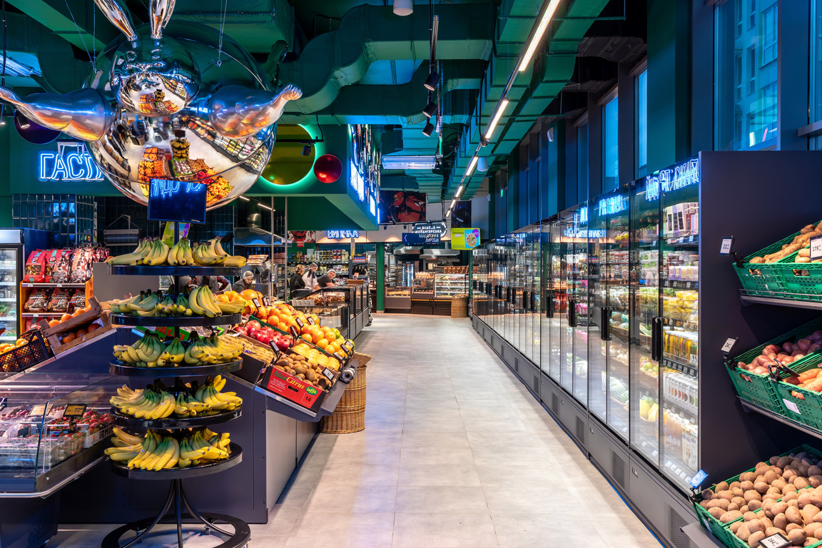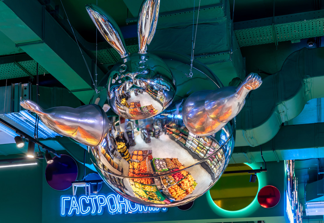 При вході Гостей зустрічає артінсталяція у вигляді людини з дзеркальної мозаїки, серце якої пульсує світлом, нагадуючи про силу життєвої енергії. У глибині магазину — дзеркальний кролик, який ніби запрошує на прогулянку до «Країни див». А зона гастрономії прикрашена дзеркальними віконцями, які створюють ілюзію входу до паралельних світів.