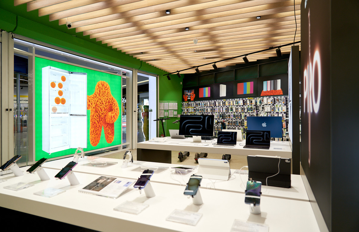 Ритейлер спостерігає збільшення попиту на цифрові категорії, саме тому одна з задач нового формату — підкреслити цю зону технологічними рішеннями. Завдяки діджитальній викладці товару, клієнт зможе дивитися цифрову техніку у цифровому світі. Так, у новому форматі можна побачити shop in shop зі смартфонами, ноутбуками та годинниками.