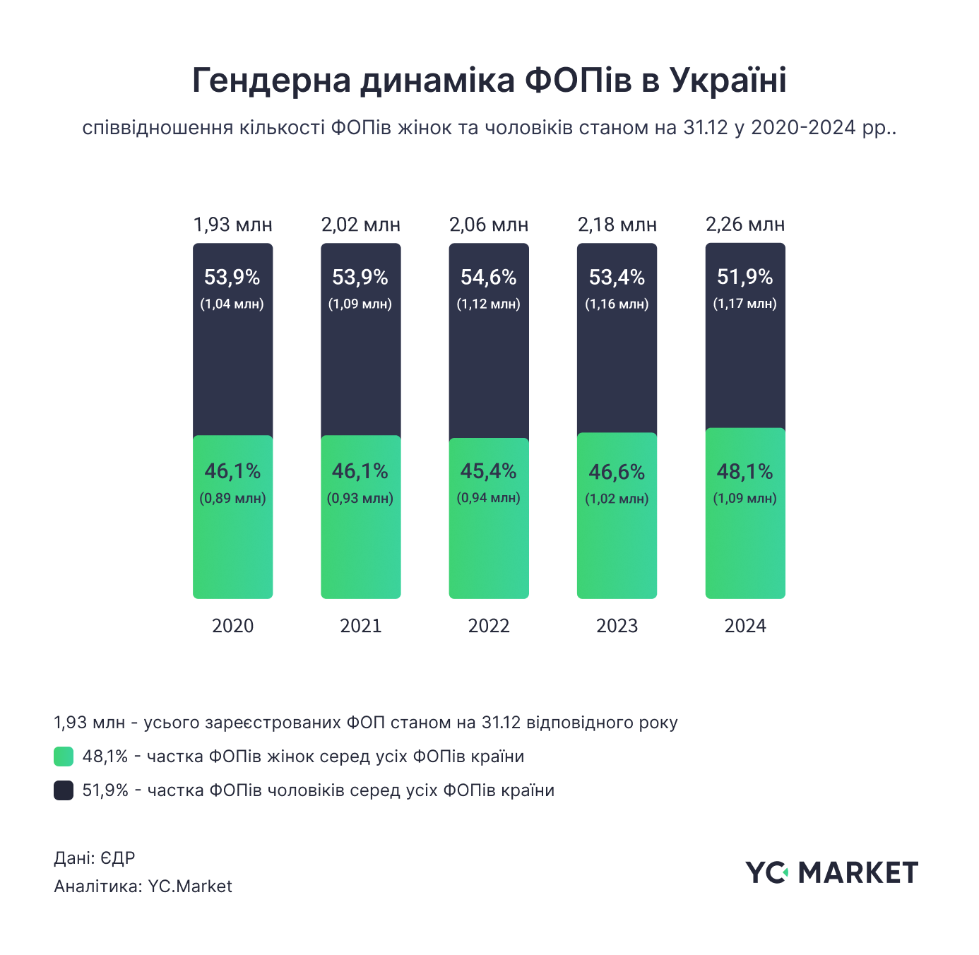Попри виклики ринкової кон’юнктури, жінки продовжують активно відкривати власний бізнес — за даними YC.Market, станом на 31 грудня 2024 року число ФОПів сягнуло 2,3 млн, з них кількість жінок зросла до 1,1 млн (48,1%), що є найвищим абсолютним показником за весь аналізований п’ятирічний період.