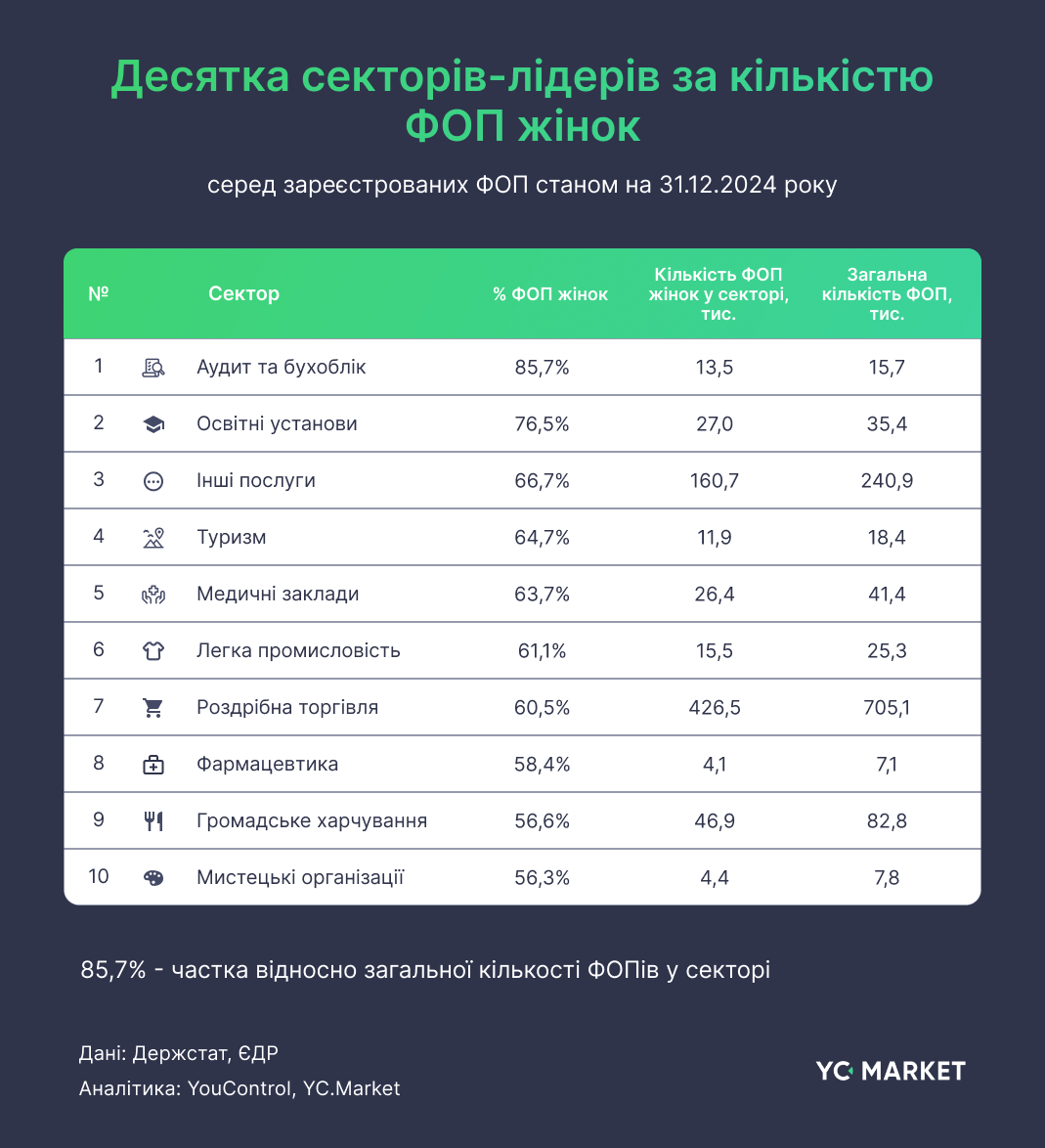 Аудит та бухгалтерський облік демонструють найвищий показник: 85,7% жінок (13,5 тис. із 15,7 тис. ФОПів) — підкреслює рівень жіночої експертизи у сфері, що вимагає точності та аналітичних навичок.