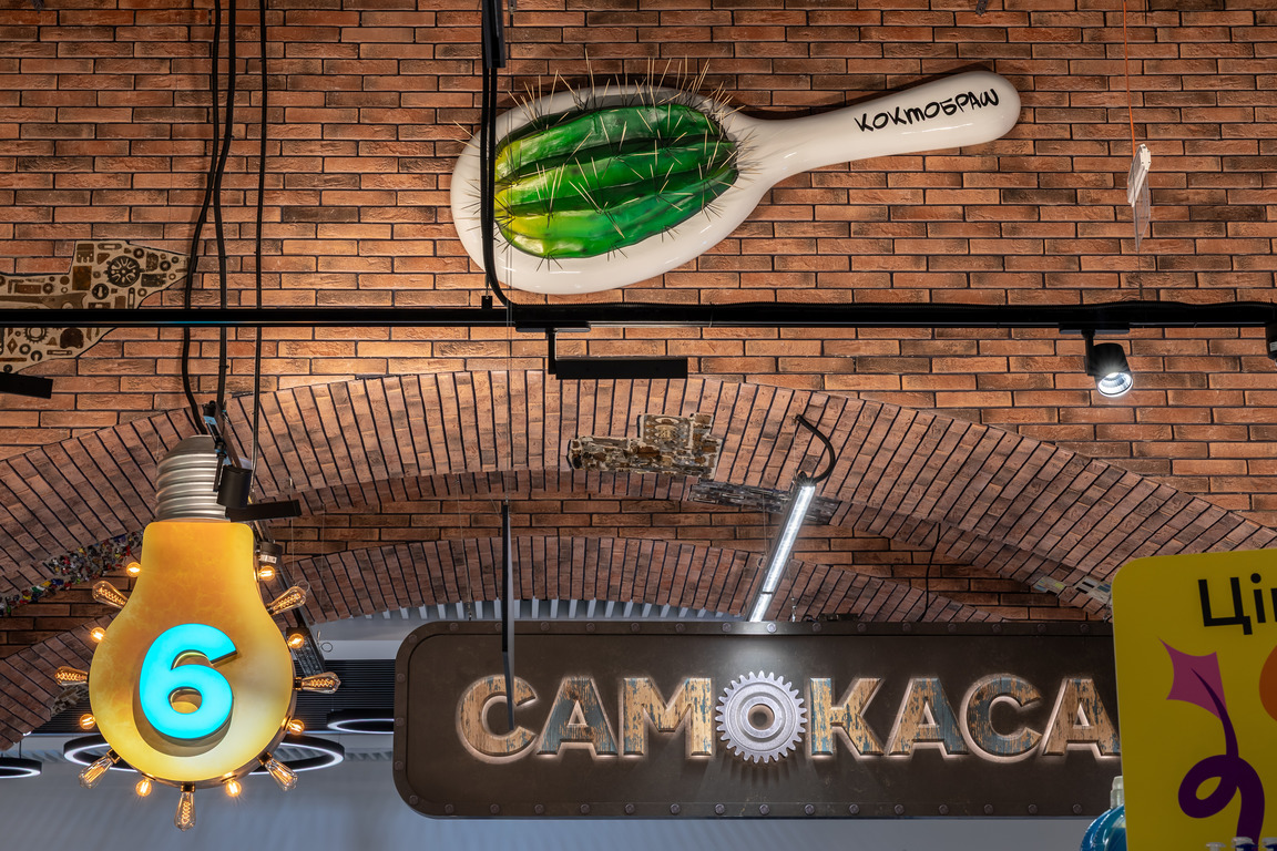 Команда «Сільпо» поєднала в дизайні магазину стімпанк і лофт: цегла, метал, зістарене дерево й бетон. Супермаркет площею 1368 кв.м наповнений незвичними предметами, які ніби балансують на межі функціональності й творчого хаосу.