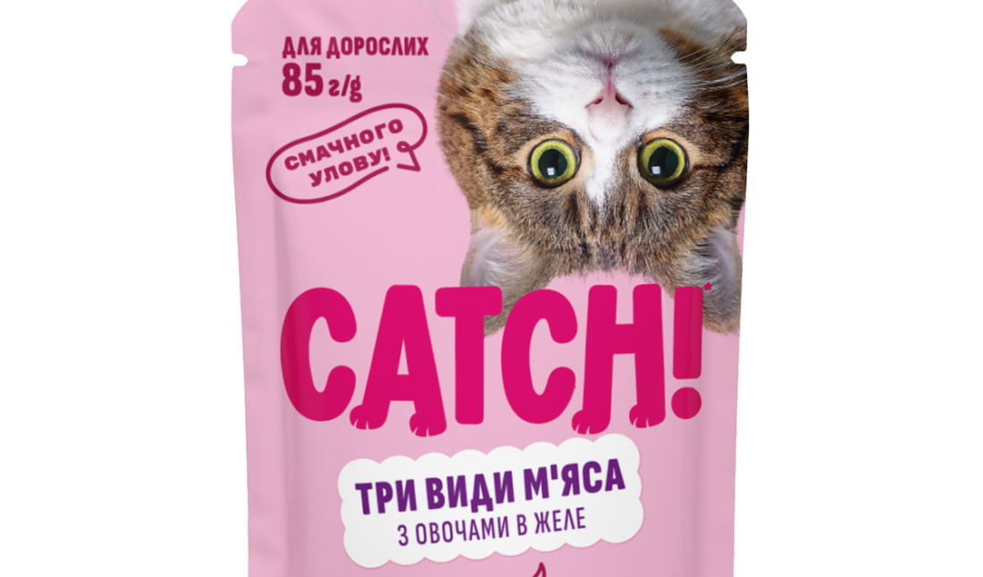 Новий бренд CATCH! створений для сегменту "економ" і пропонує повнораціонний вологий корм із високим вмістом м’яса та прозорим складом. Дизайн упаковки відображає концепцію "підглядайки": котик ніби заглядає у мисочку, щоб оцінити кількість корму.