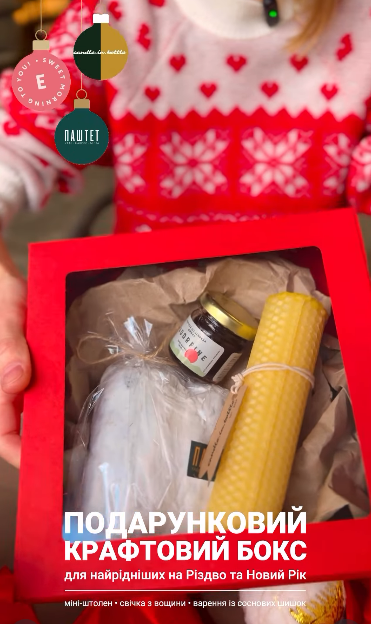 Кафе ПАШТЕТ, крафтові виробники Endorfine та CandleInBottle разом створили символічні подарункові бокси – від людей і для людей. Вони мають цікавий вміст та доступну ціну. Endorfine – це родинний бренд з Полтави, що випускає крафтові джеми та соуси. Сandle.in.bottle – крафтовий виробник свічок із перероблених пляшок. Також до боксу додали фірмовий міні-штолен від ПАШТЕТ. Він ароматний, щедро наповнений смаками та з нотами свята в кожному шматочку.