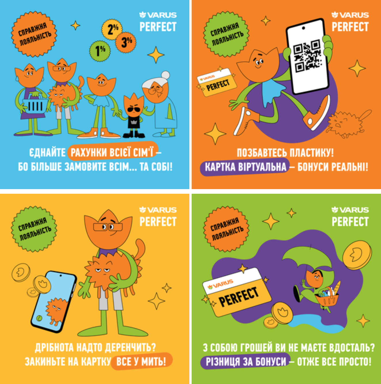 Перше правило: клієнт має чітко розуміти всі переваги, які він отримає від програми лояльності. Саме тому у минулому році VARUS здійснив масштабне оновлення програми лояльності VARUS PERFECT, вона стала більш сучасною та дружньою для клієнта. Із ним заговорили простою, живою мовою, а помічниками у комунікації стали спеціально створені герої — родина Варусенків. Саме персонажі влучно і дотепно розповідають про основні переваги програми лояльності.