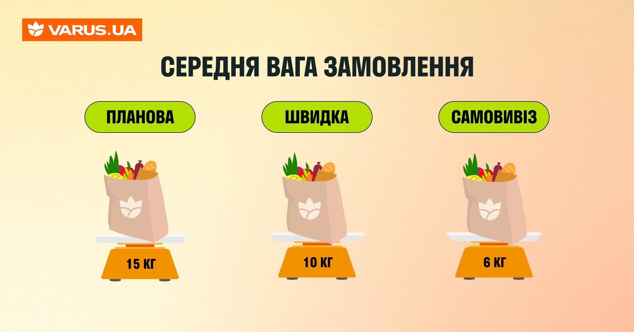 Послуга доставки розповсюджується на будь-який товар, представлений на сайті varus.ua. Для різних форматів доставки прослідковуються власні тенденції щодо обсягу замовлень. Так, найбільшу кількість позицій зазвичай замовляють планово. Найменшу, відповідно, коли обирають опцію самовивозу.