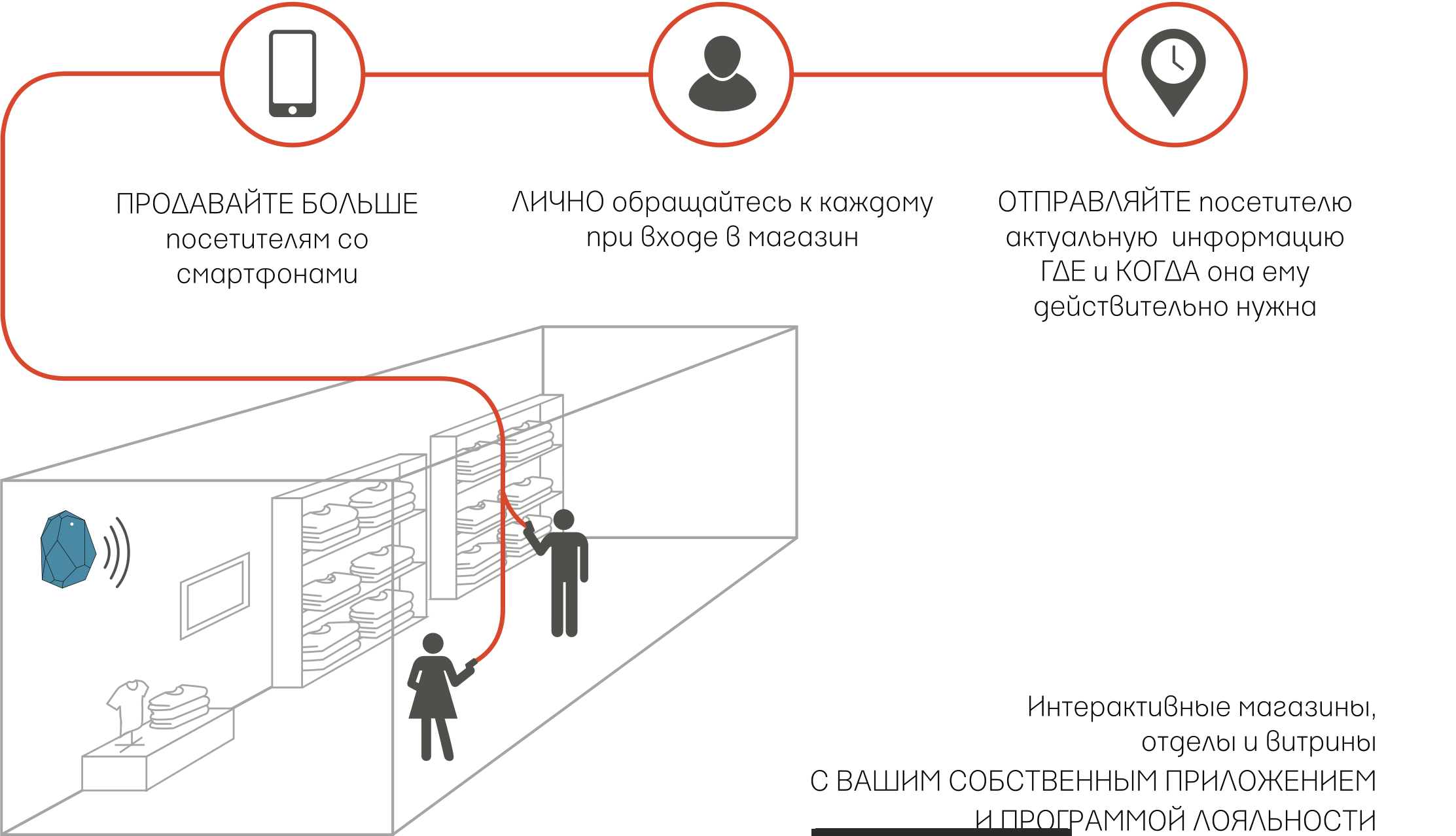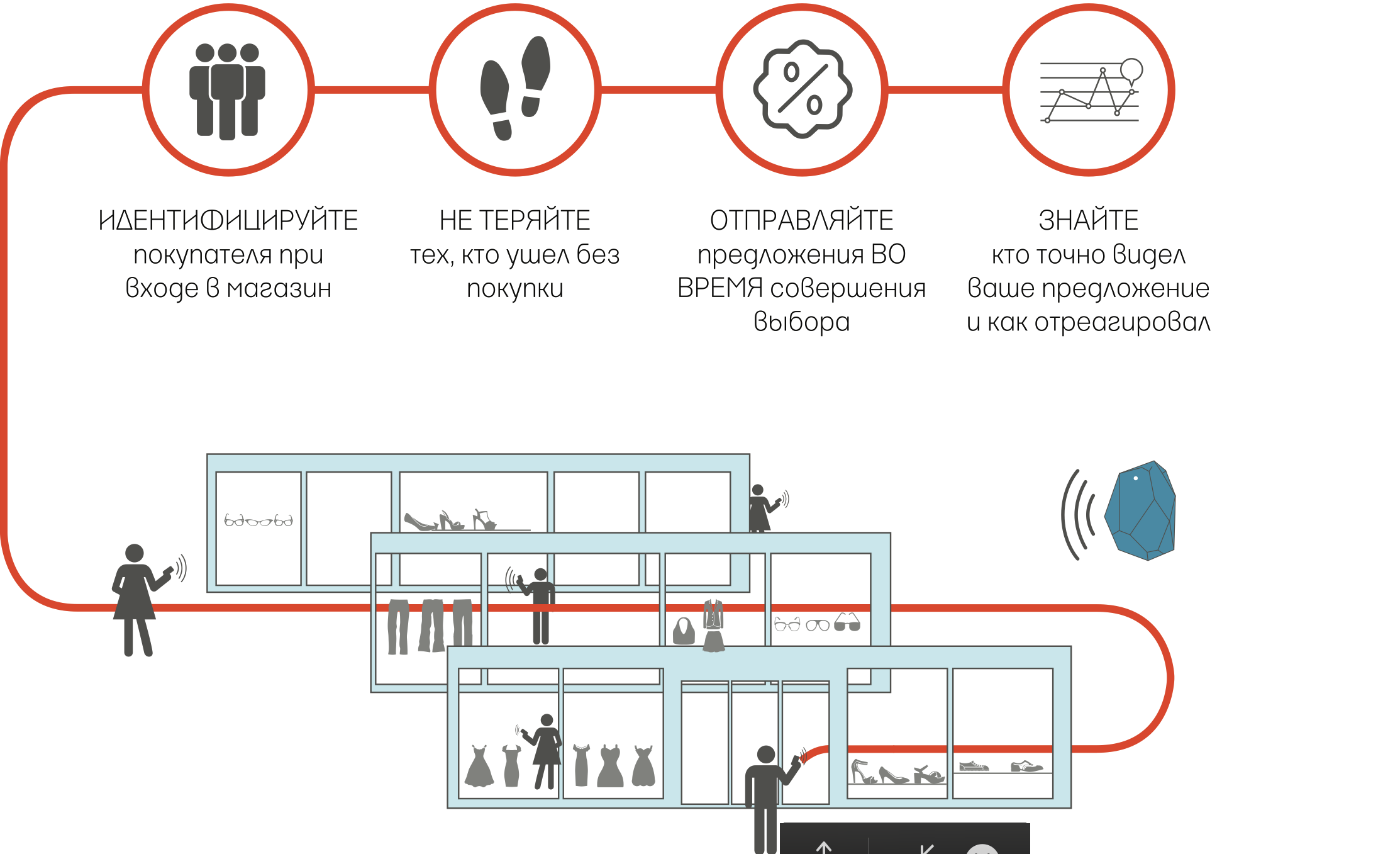 1) купоны, скидки и акции, которые приходят в смартфон пользователя по мере посещения магазина и отделов — в процессе выбора и принятия решения о покупке;