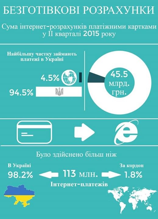 По данным регулятора, во втором квартале 2015 года интернет-платежи с использованием платежных карт составили более 45 млрд грн. Более 111 млн операций на общую сумму почти 43 млрд грн было осуществлено в Украине, а в зарубежных интернет-магазинах — менее 2 млн платежей на сумму 2,5 млрд грн.
