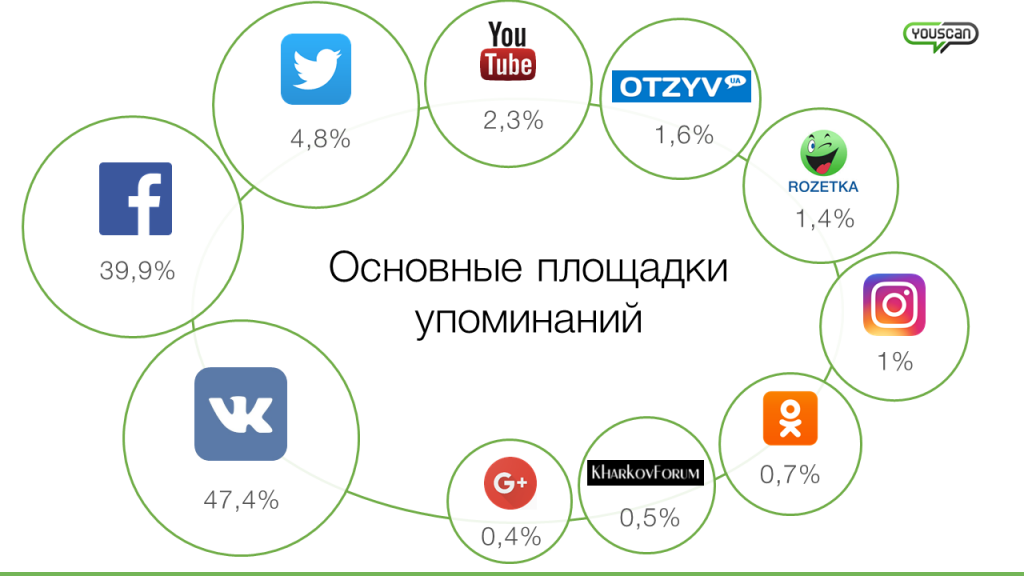 Лидерство Rozetkа по объему упоминаний в социальных медиа вполне закономерно, но стоит отметить совсем незначительное отставание Comfy и «Цитруса». Важно, что помимо традиционных лидеров — «ВК», Facebook и Twitter — на других площадках украинский e-commerce также обсуждается, хоть и менее активно.