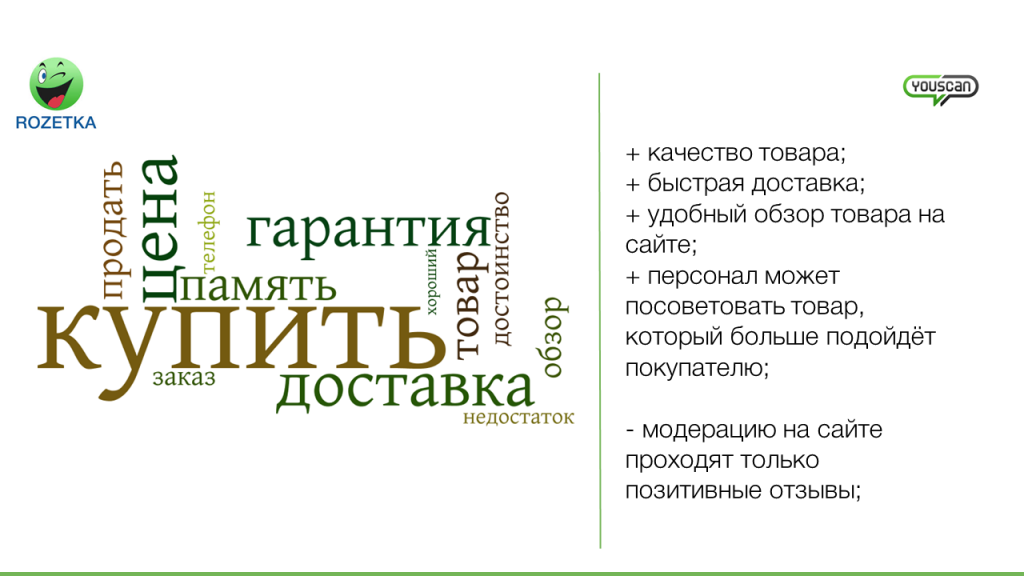 У Rozetka много сильных сторон, в том числе и работа выделенного выставочного зала, где компетентный персонал может дать полезный совет покупателю. Сеть отмечает удобный интерфейс магазина и большой ассортимент товаров. С другой стороны, компании стоит обратить внимание на жалобы пользователей о заангажированности модераторов отзывов на сайте компании, которые «пропускают только позитив».
