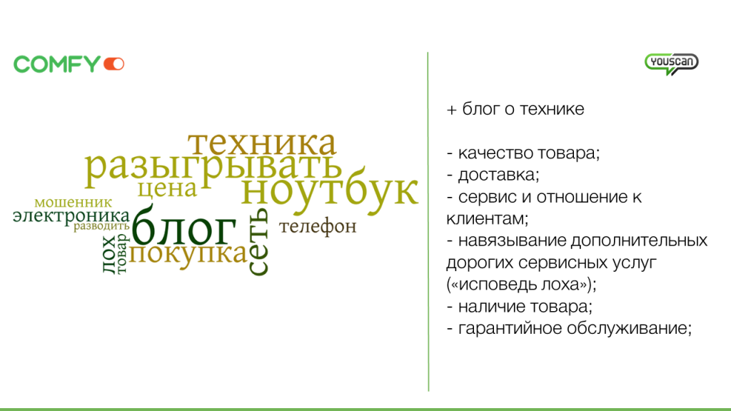 У Comfy отличный блог о технике, согласно отзывам пользователей, но в то же время есть довольно много проблем. Покупатели жалуются, что представители компании навязывают покупку ненужных дополнительных сервисных услуг. Стоит обратить внимание на активно обсуждаемый инцидент с затоплением магазина в Харькове, произошедший в начале августа, после которого потенциальные клиенты компании подходили с осмотрительностью к покупке техники в этом магазине. Особого внимание также заслуживает резонансный кейс покупки смартфона девушкой с вполне обычным профилем на Facebook, который собрал более 500 органических репостов.
