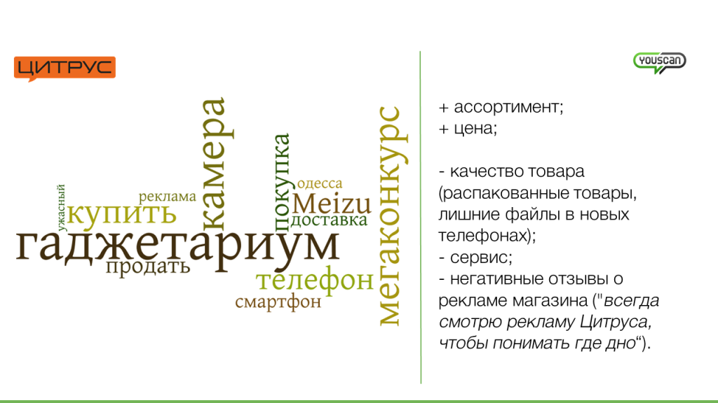 YouScan рекомендует не бояться отзывов пользователей, особенно негативных, а рассматривать их как возможность получить бесплатно обратную связь и улучшать свой бизнес. Изучение упоминаний в социальных медиа позволяет выявить сильные и слабые стороны брендов, а также понять, что больше всего волнует аудиторию в данный момент. Ниже приведены результаты контент-анализа пользовательских постов о четырех самых популярных по объему потока упоминаний среди пользователей интернет-магазинах.