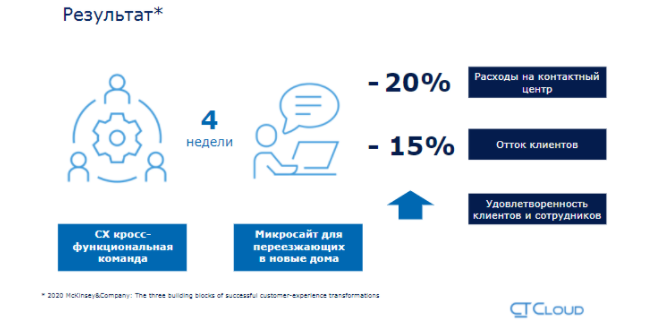 Результат не змусив на себе довго чекати. Витрати на контакт-центр знизилися на 20%, відтік клієнтів на цьому етапі скоротився на 15%. Зросла радість і клієнтів, і співробітників. І це результат роботи лише на одному етапі Customer Experience. Уявіть, якого результату можна досягти, якщо працювати з різними групами клієнтів і на різних етапах їх шляху.