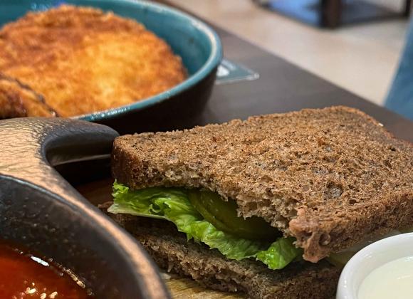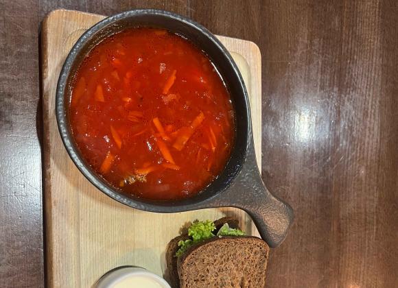На смак – неймовірний борщ, з легкою кислинкою. Наваристий, насичений червоний колір і величезний шматок ребра (все ж, The Мʼясо). За канапку коментарі зайві – це класика. Однозначно вартує всіх витрачених грошей.