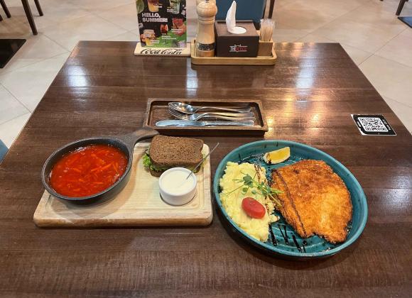 На жаль, ми не потрапили у Spartak у цей час, тому довелось обирати із загального меню. Офіціантка порадила обрати бургери – сказала, що вони у ресторані найсмачніші. Але оскільки ми навпаки тікали від бургерів і шаурми, то обрали борщ з канапкою за 159 грн. І за рекомендацією працівниці – картопляне пюре зі шніцелем за 360 грн.