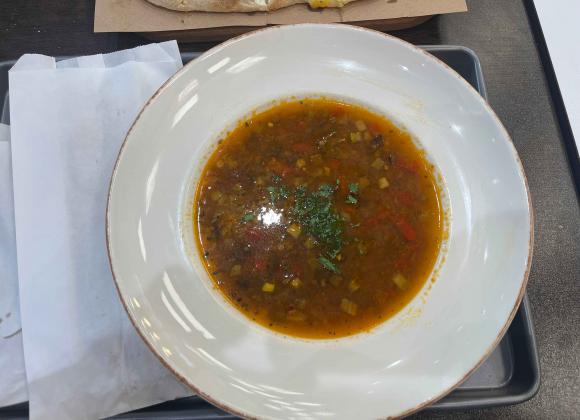 Але спершу спробували болоньєз. Суп насичений і густий, овочі мʼякі, майже розварені в пасту. Але трохи жирний – зверху є шар олії і лишається відповідний присмак. Проте як для першої страви – згодиться.