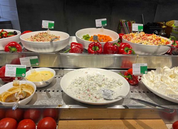 Є салати, гарніри (запечена картопля, гречка), перші страви, мʼясо (сосиски, відбивні) та солодке (сирники, млинці, десерти).