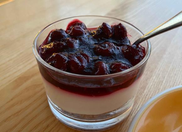 Каву з чізкейком принесли десь за 5 хвилин. Десерт виявився смачним, з великою кількістю вишень. Трохи “маслянистий” сам сир, проте загалом супер: не надто солодко й не надто приторно.