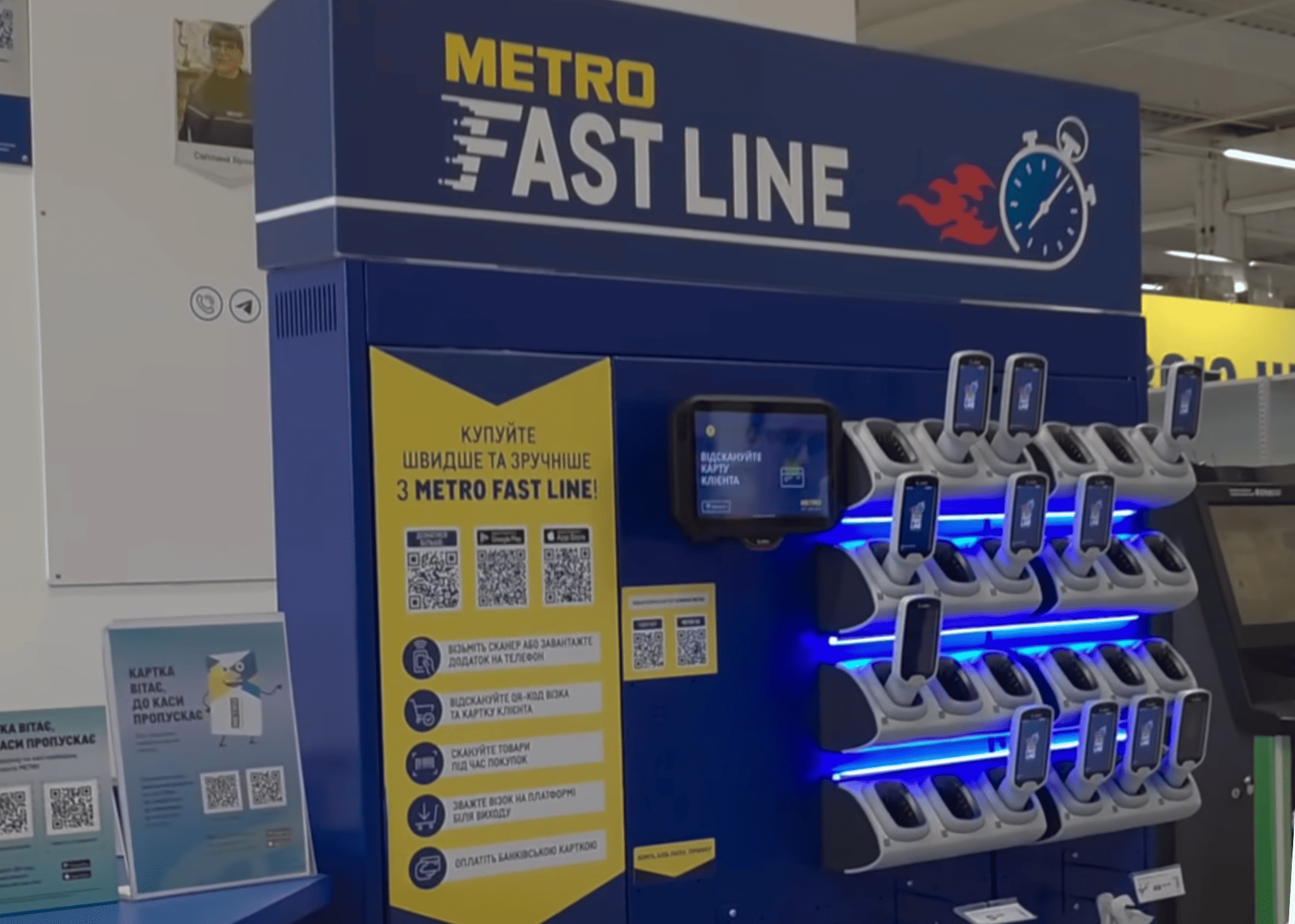 Метро має свою окрему екосистему для самостійних покупок – Fast Line. Загалом це перша в Україні безконтактна система сканування, зважування та оплати товарів.