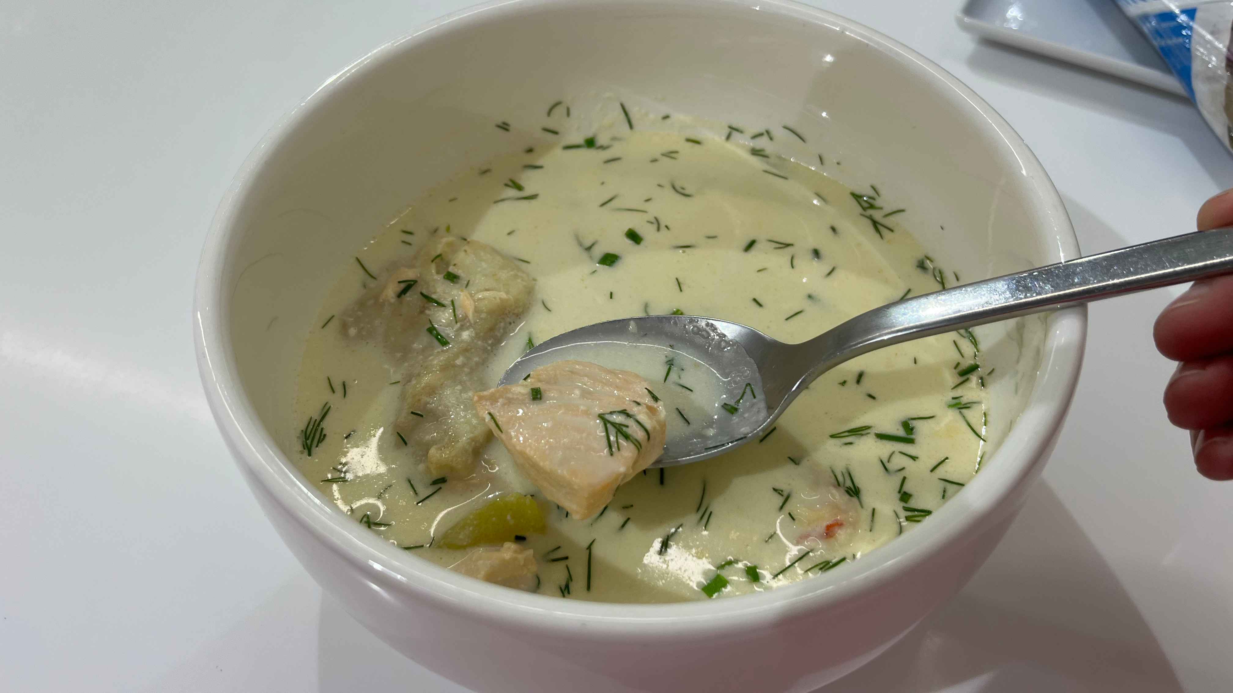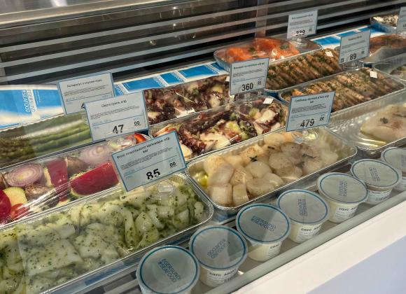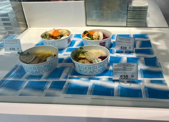Дійсно, бренд входить до складу норвезького рибного холдингу Pelagia AS, який є одним із найбільших виробників риби в Норвегії та постачає продукцію у понад 35 країн світу. Але суші ми цього разу тут не спробували. Навмисно. В зоні видачі take-away, де можна взяти одразу готову їжу або заморожені морепродукти, ми в лоб запитали касира: “В нас обмежений бюджет. Чи реально вкластися в 400–450 грн і так, щоб наїстися?”. Дівчина не розгубилася і без жодної нотки зверхності порекомендувала спробувати фірмовий норвезький суп і сендвічі.