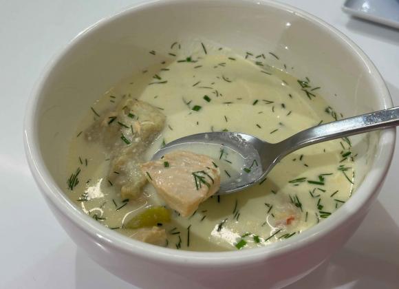 Суп “Егерзунд” обійшовся у 247 грн. Офіціант розповів, що його готують на насиченому рибному бульйоні з хеком, лососем, креветками та овочами. Подають страву з цільнозерновою булочкою. За смаком суп яскраво вершковий, а всі морепродукти та спеції між собою метчаться. Він ситний.