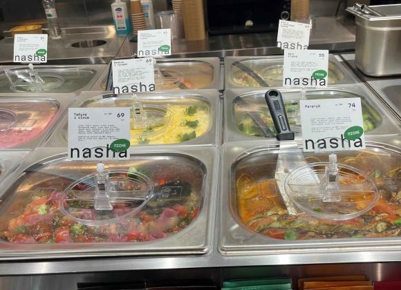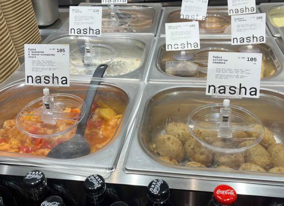 Наступною точкою нашої ревізії стала NASHA by Cheesecake Family. Тут продають домашню зрозумілу кухню. Подивились і подумали: “Чимось схоже на формат їдальні “Пузатки”, але в рази менший: вітрина з асортиментом готової їжі, жива черга, самообслуговування.