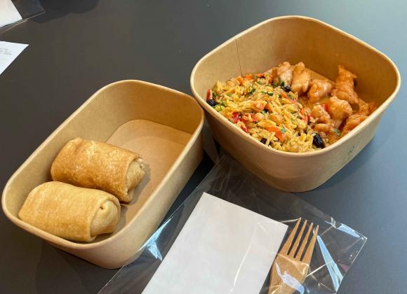 До речі, їжу тут подають не на тарілках, а за замовчуванням у картонних контейнерах. Один коштує 12 грн. Хоча б не довелося платити за одноразові столові прибори — і те добре.
