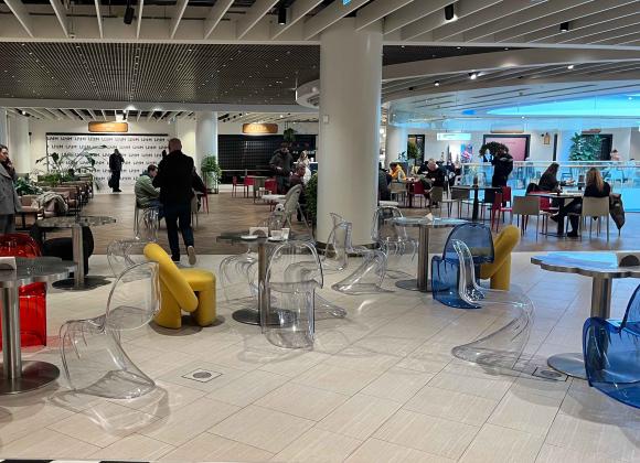 Далі з ресторану ми перемістилися у більш галасливий фуд-хол. Публіка різна: заклопотані офісні працівники, fashion-girls в кепках від Руслана Багінського, бізнесмени. Простір 6-го поверху був заповнений десь на чверть, і нам вдалося знайти вільний столик зі зручними диванами.