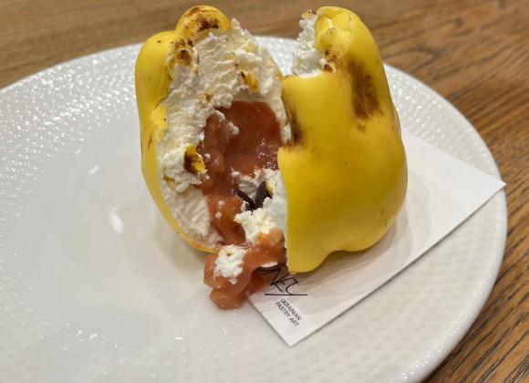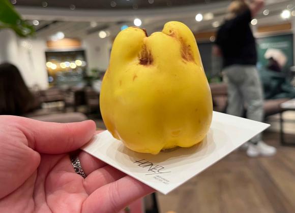 Але ми зрештою зупинились на десерті Айва за 387 грн. Візуально це майже точна копія справжнього фрукта з природною “неідеальністю”. Шедевр, справжня ювелірна робота, навіть черв'ячка не вистачає для повної візуалізації. Усередині, як виявилося, цілі шматочки айви, айвовий гель і кондитерський крем юзу-ганаш на білому шоколаді. На смак — делікатний і з легкою терпкістю. Подається на підложці для десертів. Ми щиро сподівалися, що за таку суму і вона буде їстівною, але ні — звичайний папір.