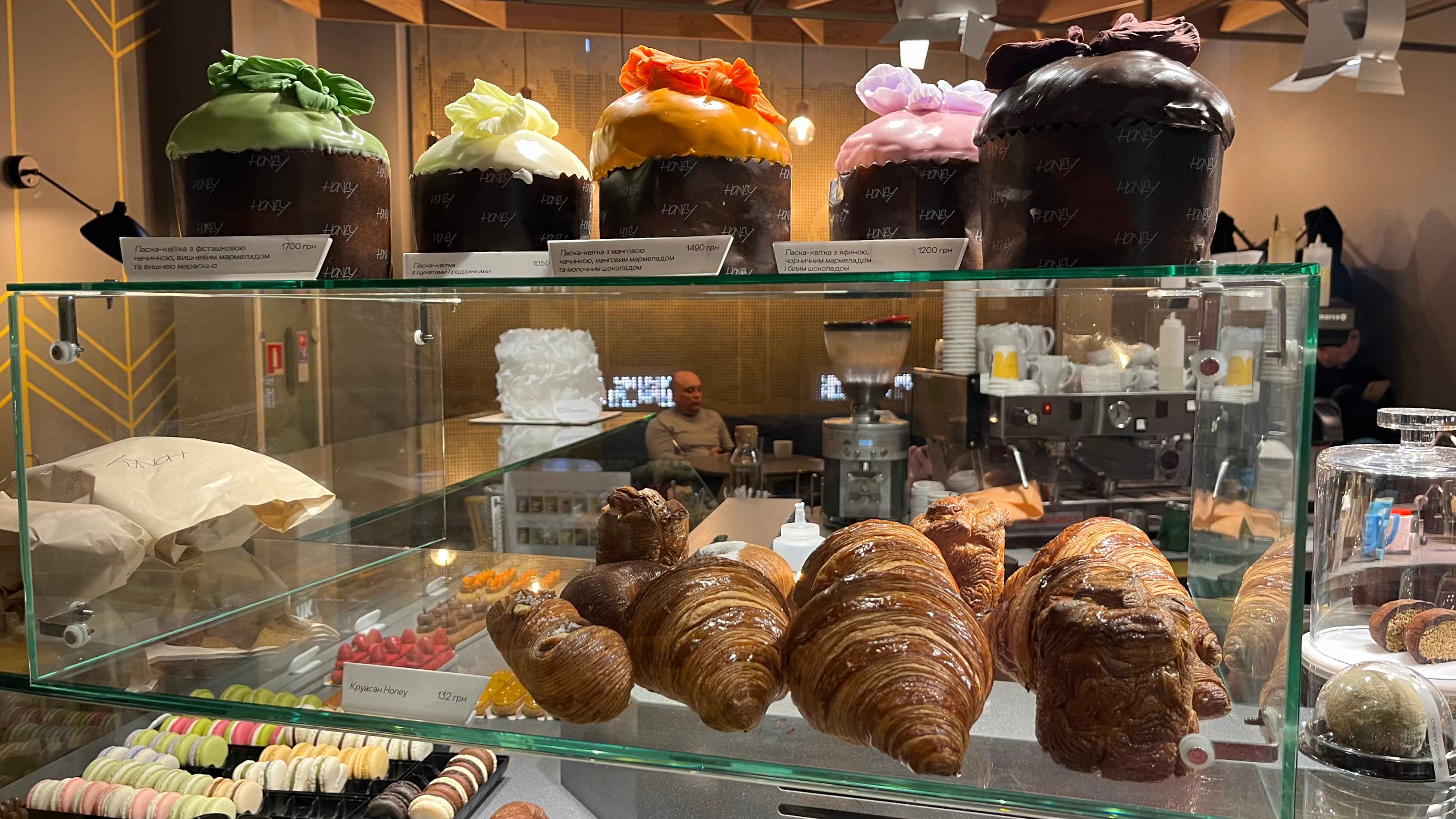 Що загалом по цінах в Honey? Десерти — від 355 до 410 грн. Еклери — від 185 до 325 грн, сет із трьох — 565 грн, сет із шести — 1204 грн. Великодні паски від 365 грн.