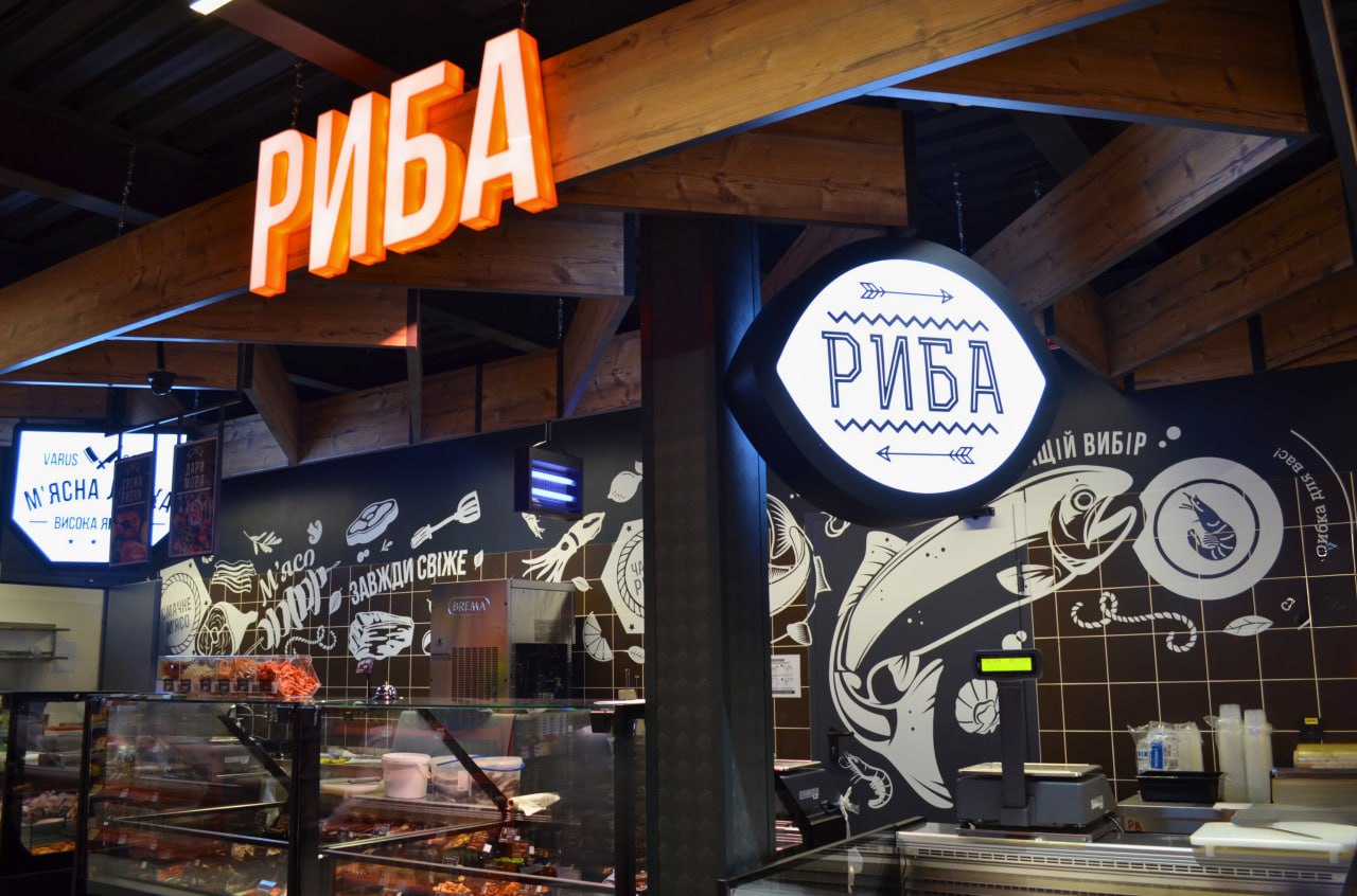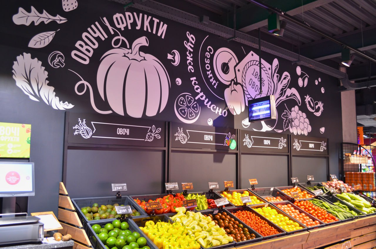 Ці елементи створюють не просто магазин, а атмосферу справжнього ринку, де є душа і тепло. Принти та холодна деколь на стінах, лайтбокси та таблички на стелажах — усе це допомагає легко орієнтуватися та робить шопінг інтуїтивно зрозумілим.