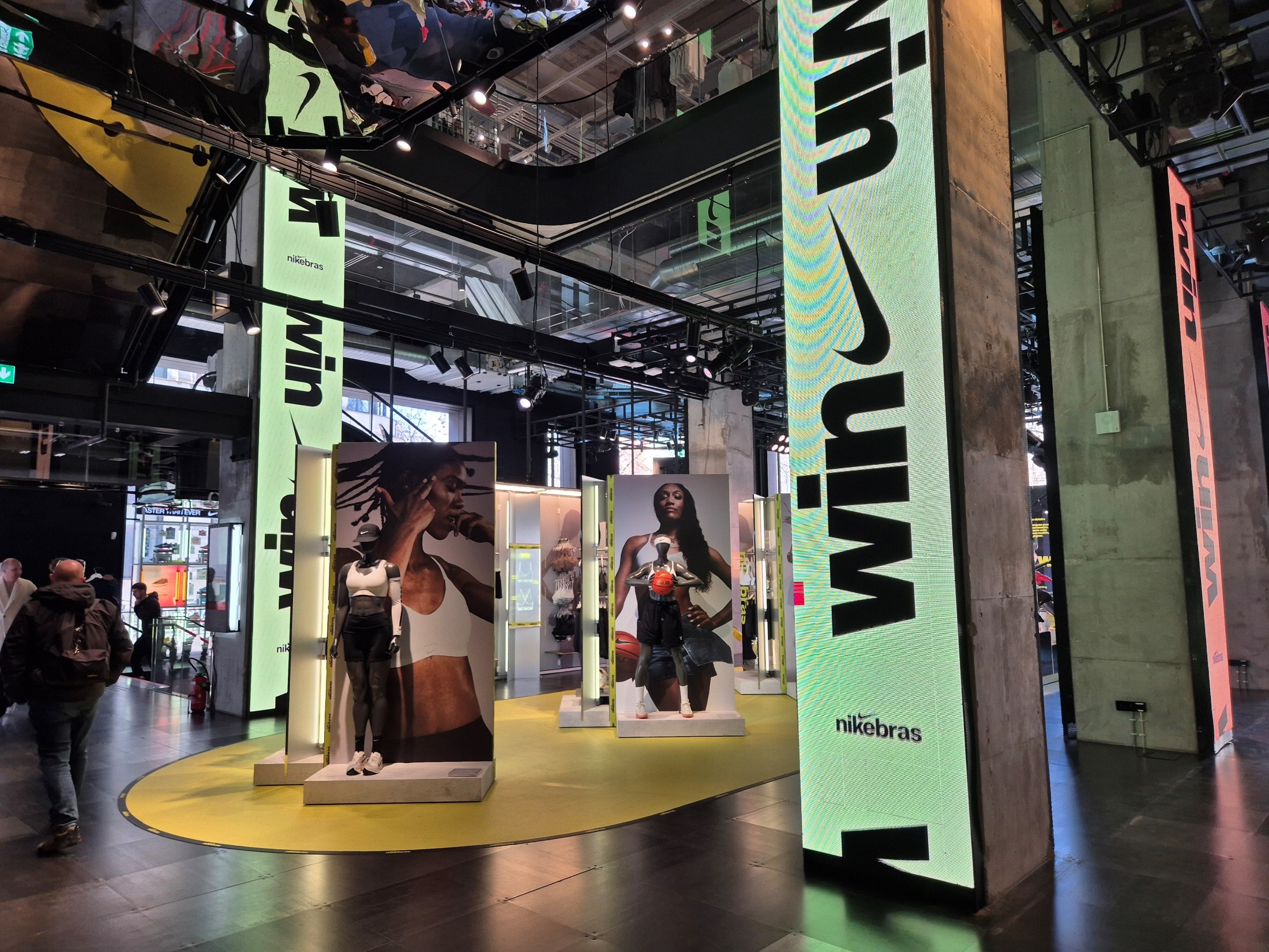 У флагманському магазині Nike на Єлисейських Полях цілий поверх присвятили жіночому одягу та інноваціям у дизайні бра, а вся візуальна кампанія магазину підкреслювала роль жінки та технологічний підхід бренду до комфорту. Особливу увагу приділили тому, що жінки в спорті потребують спеціального одягу, розробленого з урахуванням їхніх особливостей. І це не соромно — це гідно. У магазині є навіть «стіна інновацій для жінок», яка демонструє, як створювалося взуття та спортивний одяг на основі реальних даних — від рівня навантаження до потовиділення.
